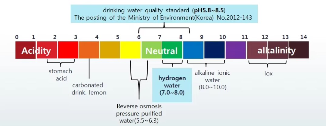 pH is the index as a value indicating the degree of acidity or alkalinity of water. On the basis of pH7.0, lower degree means acidity and higher degree means alkalinity. Commonly human body's acidity(pH) is 7.35~7.45, is alkalescence, the water that has higher acidity(lower pH) than human body can cause 'the oxidation'.