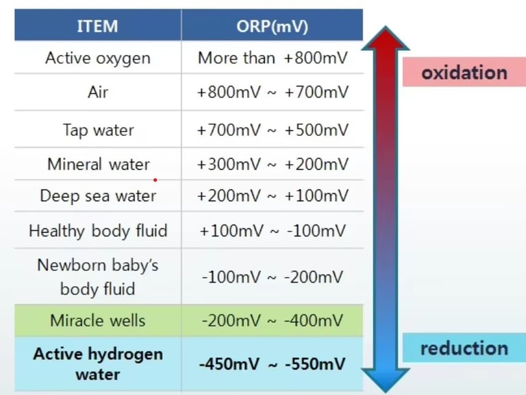 The positive(+) ORP means high oxidation, the minus(-) means high reducing power, in other words, the water of higher ORP will oxidize our body.